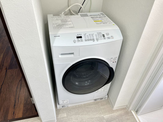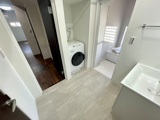 洗面台が置かれた脱衣所にはドラム式の洗濯機もあります。