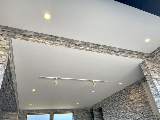 ガレージ奥には換気が出来る窓、天井には埋込式のダウンライトやライトレールも完備。