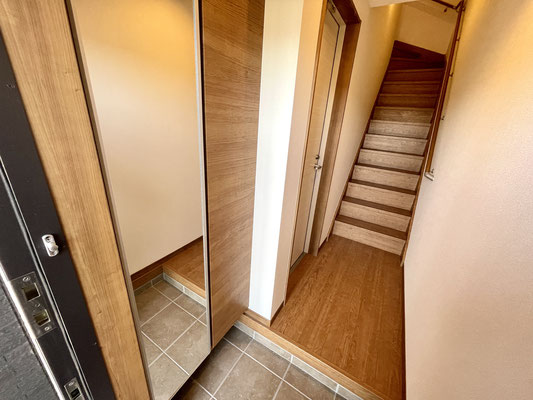 玄関を入ってすぐ左手には姿見付きの大型下駄箱収納。