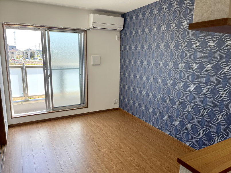 赤茶色のフローリング床とアクセントクロスが特徴的な落ち着くリビング・ダイニング。