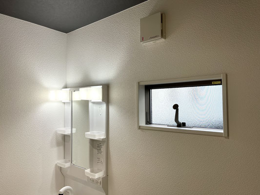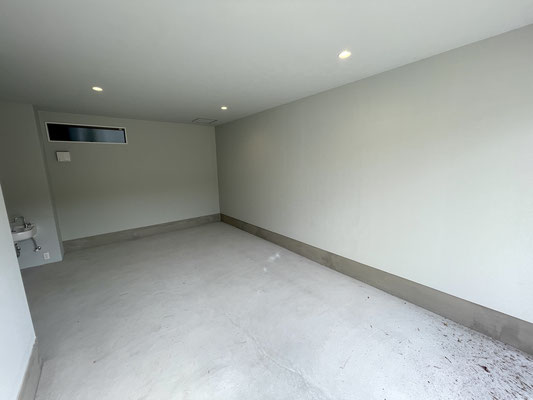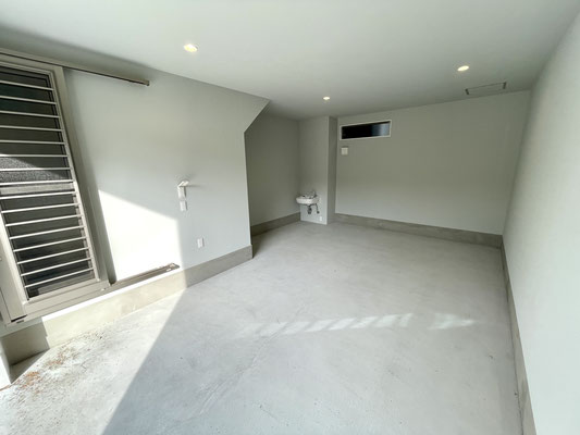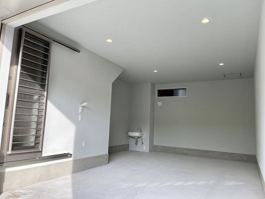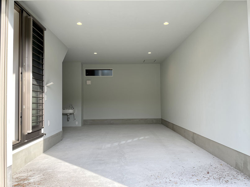 ガレージ内には換気の出来る窓や手洗い水栓なども完備。