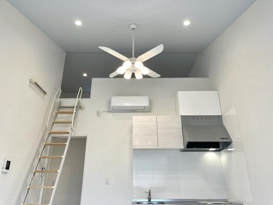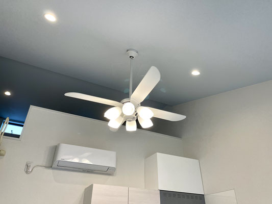 お部屋のアクセントになっているのはシーリングファン付きの照明器具。