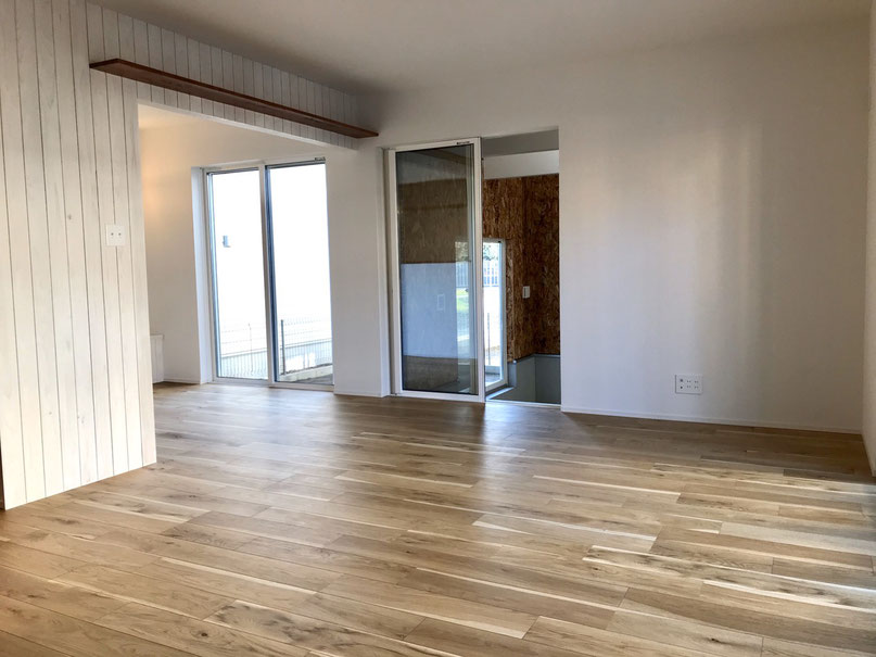 約16.5帖のリビンクとつながるガレージとカバードポーチが
