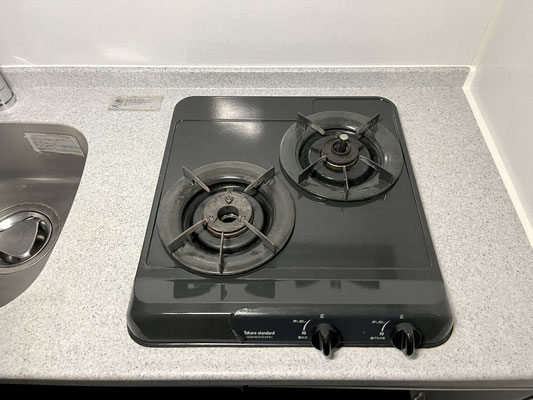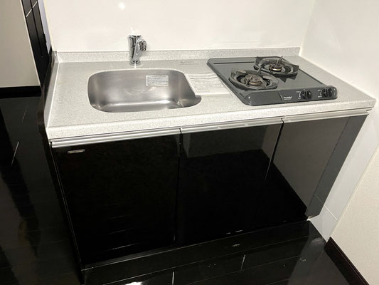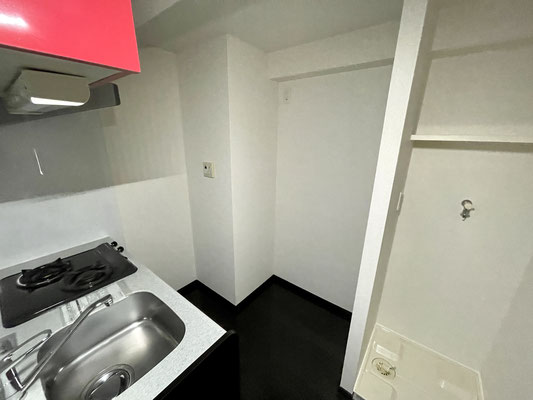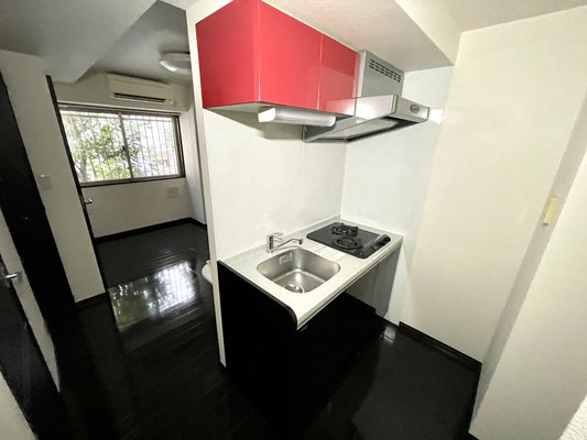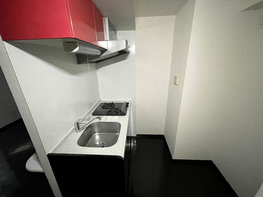 お部屋の奥に行くと1KのK部分、キッチンがあります。