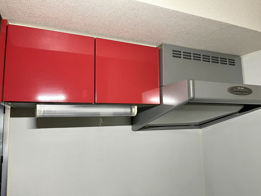 可愛いサイズのキッチンは上部収納がアクセントで真っ赤なのが良いね〜