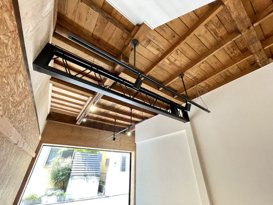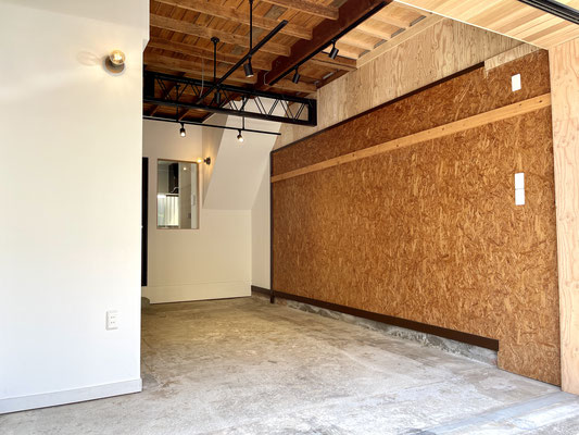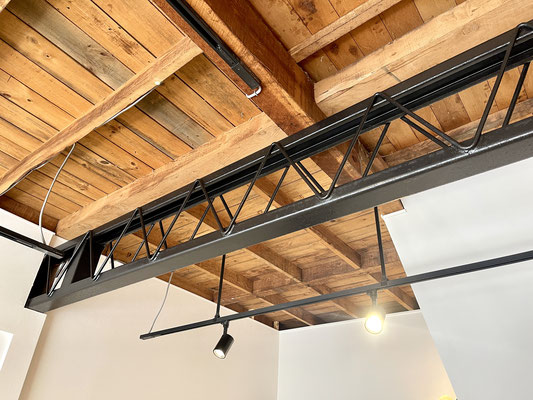 木造の建物ですが天井にある鉄骨がインダストリアルな雰囲気を醸し出していて良いね〜