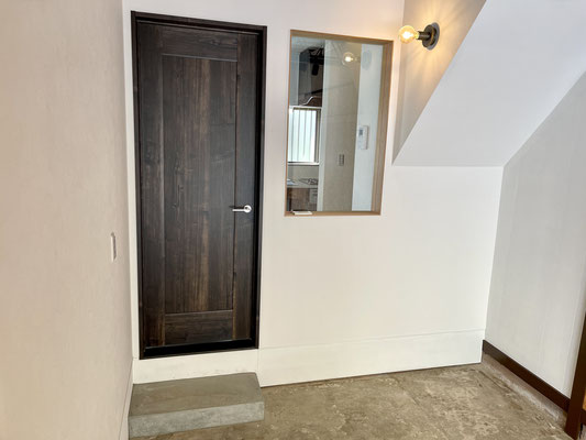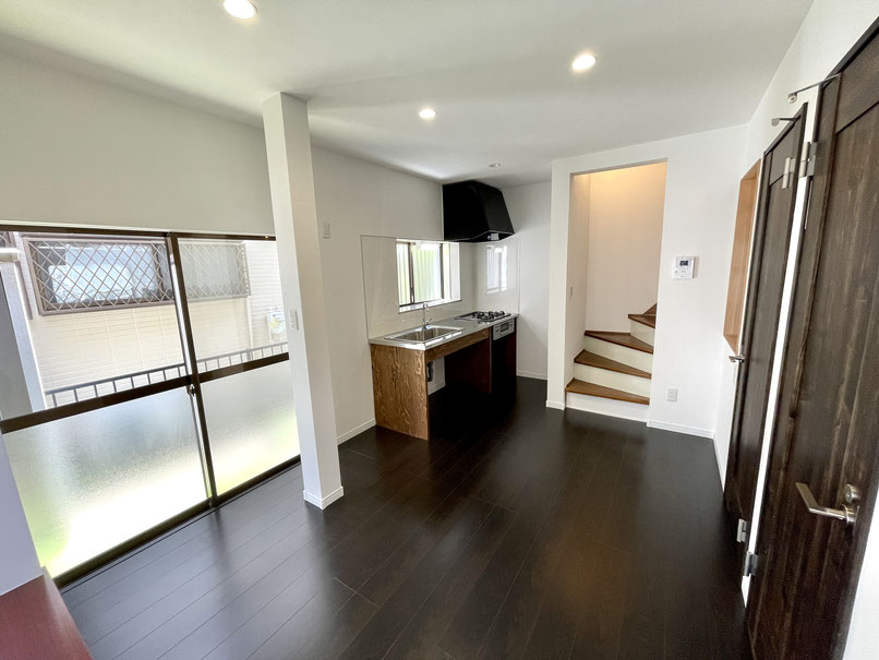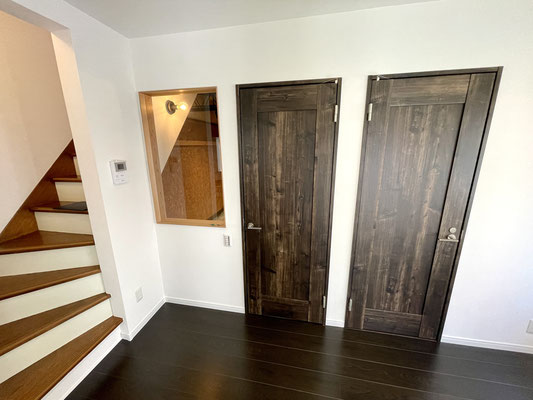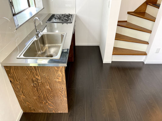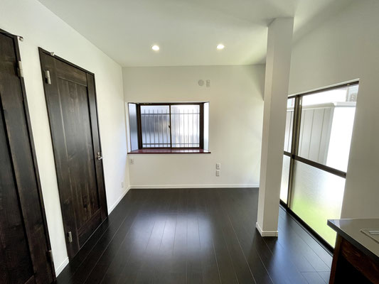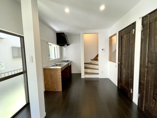 7.2帖のDKは濃い焦げ茶色のフローリングと新設されたヴィンテージテイストのドアが特徴的。