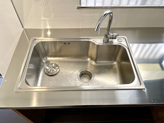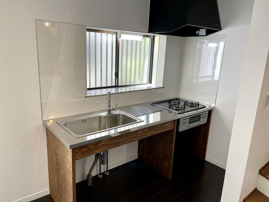 お部屋の中にあるキッチンはステンレスと木材を組み合わせたオシャレな仕様。