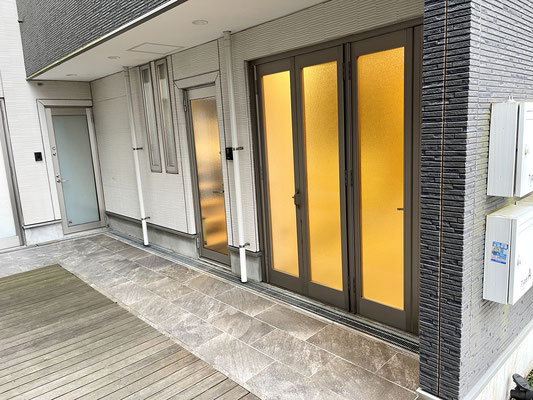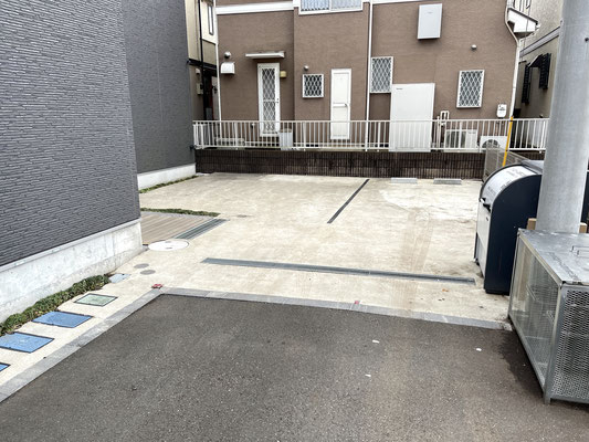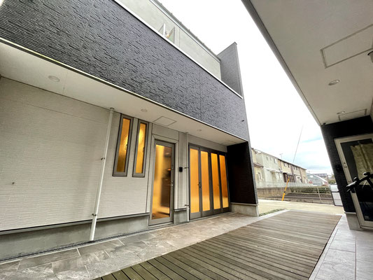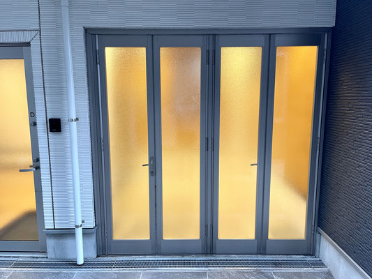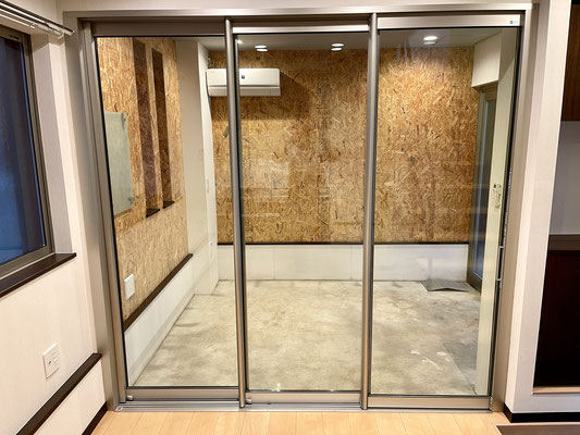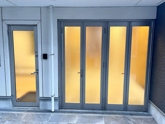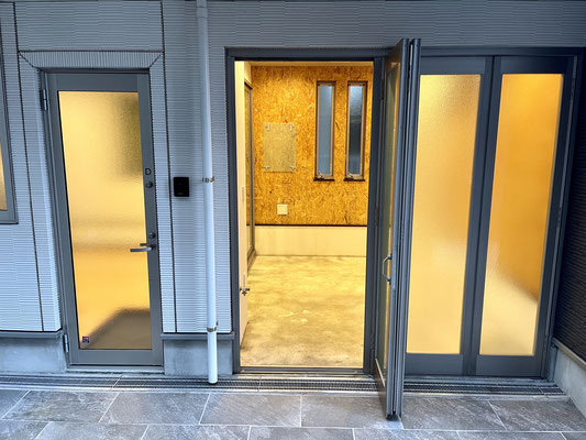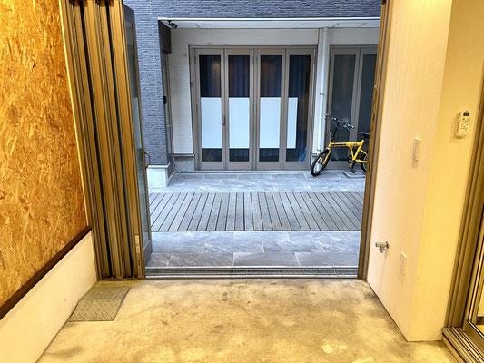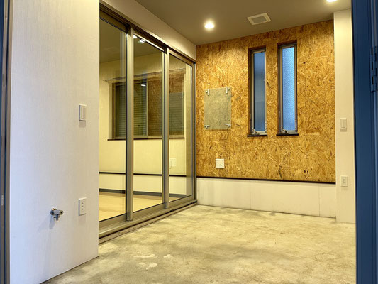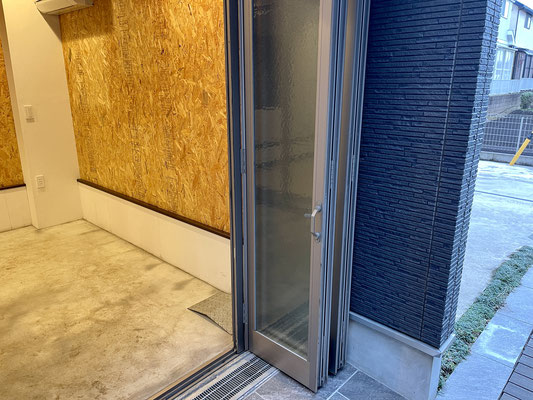 ガレージ出入り口はアコーディオンドアなので半分だけ開けたりも出来るスグレモノ!