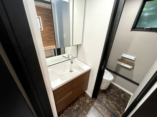 こちらも横長の大きな鏡と換気が出来る小窓付き〜