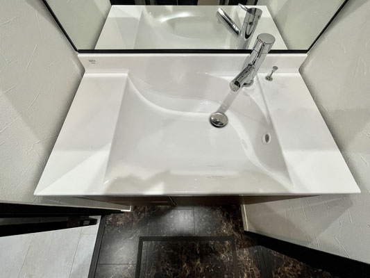 鏡部分が広い洗面台は便利ですし空間が大きく見えるメリットもあります。