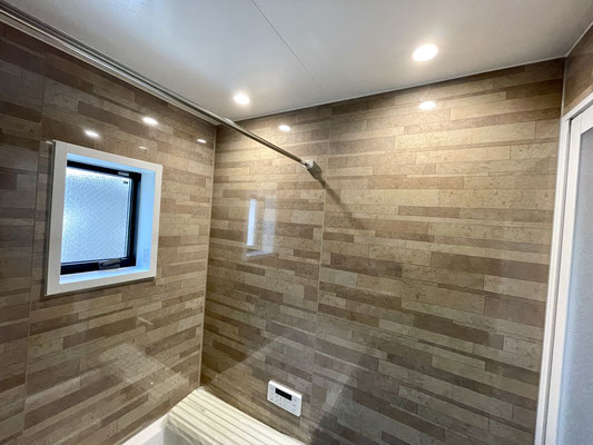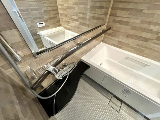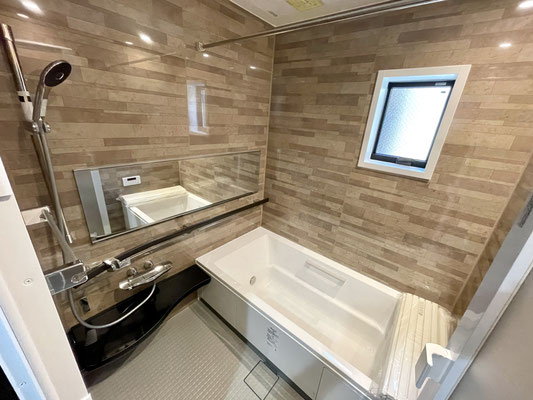 物件のサイズ感からしても大きめなバスルームはライトブラウンで落ち着く空間。