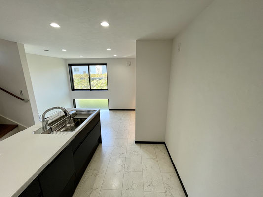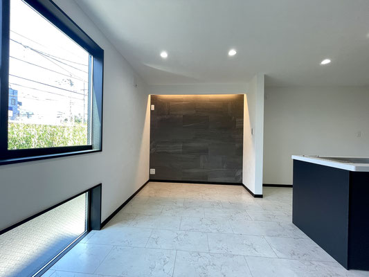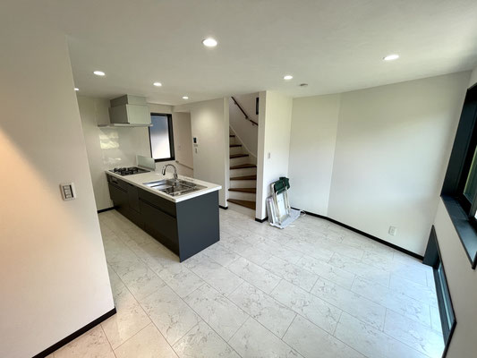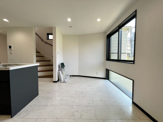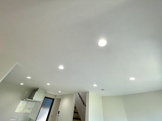 天井には埋込み型のダウンライトも設置済でまるでモデルルームのような清潔感のあるリビング。