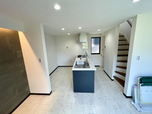 2階に上がるとドドーンと存在感のあるペニンシュラキッチンが目に入ります。