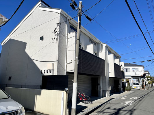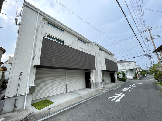 物件外観は2棟の建物が繋がったような凝ったデザインのガレージハウス。