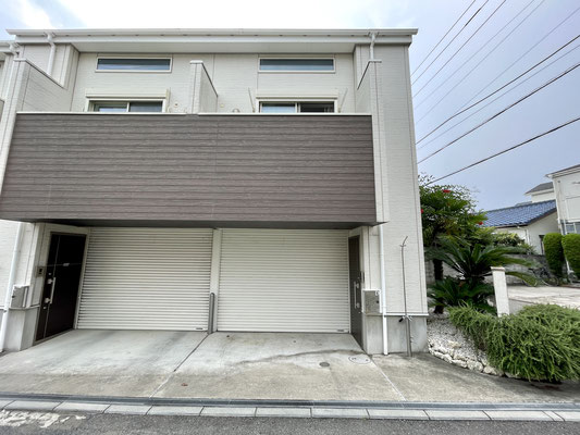 ホワイトな外壁とガレージシャッターに突き出たような形状のブラウンのバルコニーがアクセントになって良いね〜