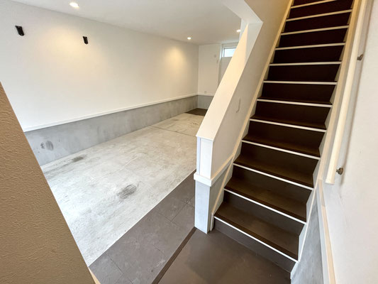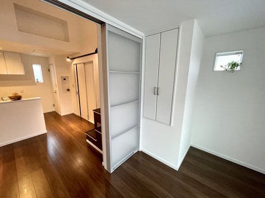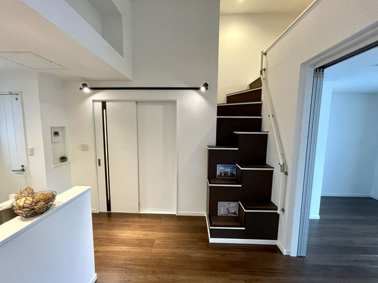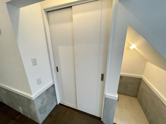 登りきった先にはリビングに通じるスライドドアと大きな下駄箱収納があります。