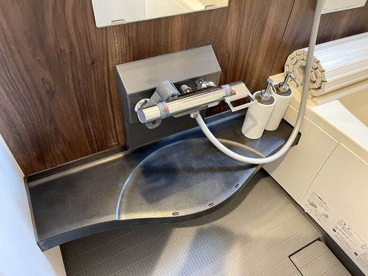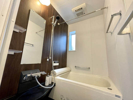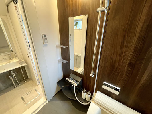ブラウンな木目が美しい清潔バスルームです。