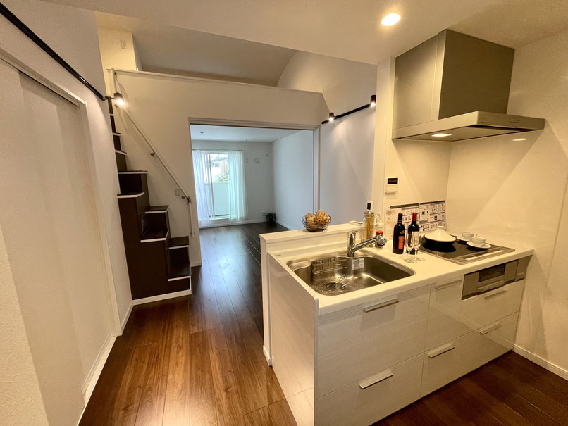 背面には収納棚も設置され、お手入れのしやすいIHコンロと大きなシンクで自炊派の方も大満足の仕様です。
