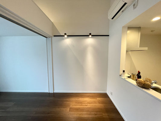 落ち着いた濃いブラウンのフローリングと2箇所に設置されたライティングレールの照明が良い雰囲気の空間。