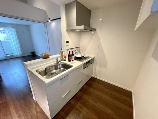 爽やかなホワイトのキッチンは調理に十分な広さがあります。