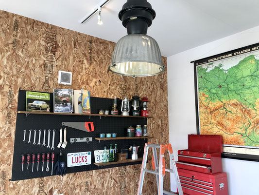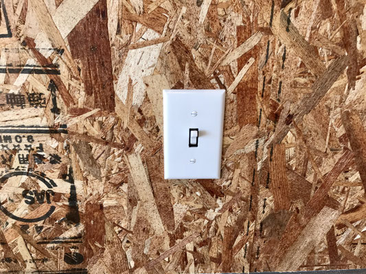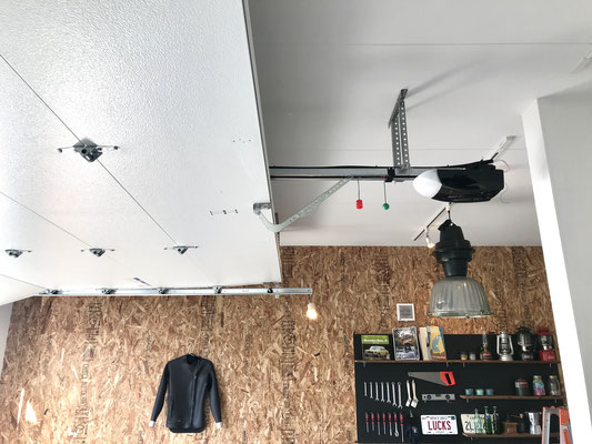 ガレージの壁は一方がOSB合板になっており、DIY派にも嬉しい作り。