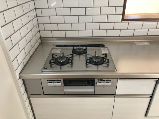 お料理好きも満足のガス三ツ口コンロに大型シンク