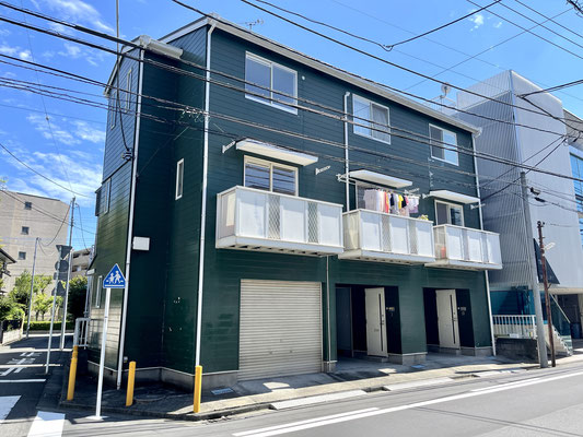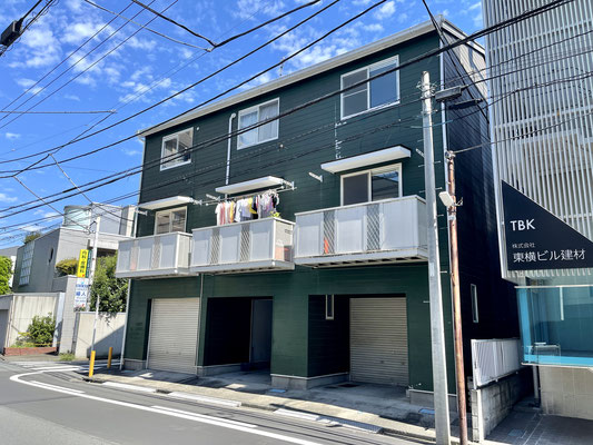 建物は角地に建設されたブリテッシュグリーンの3戸物件。