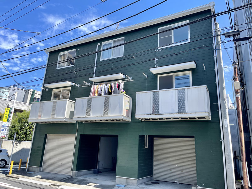 建物は角地に建設されたブリテッシュグリーンの3戸物件。