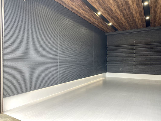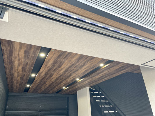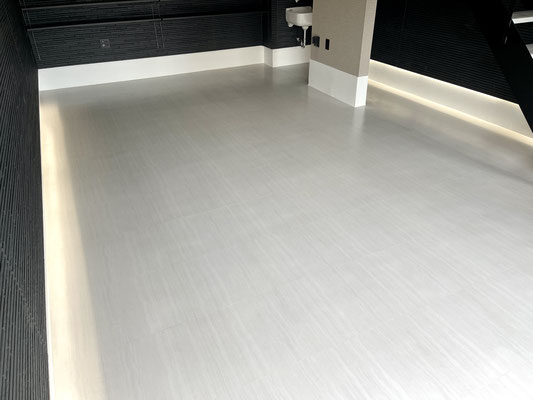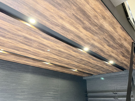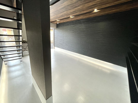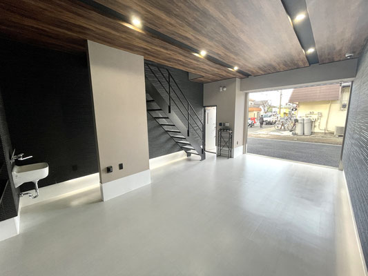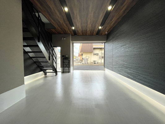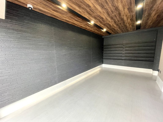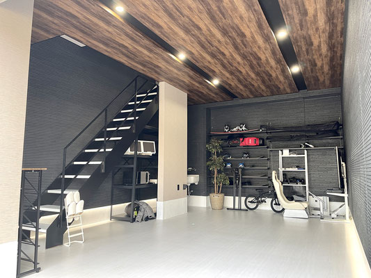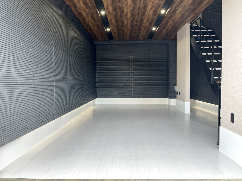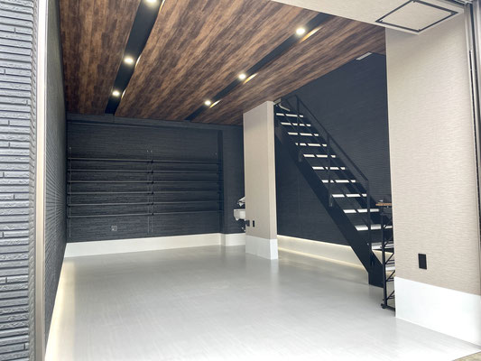 外壁同様のブラックの壁とウッド調の天井、タイル床、各所に設置された照明がゴージャスな雰囲気のガレージ!