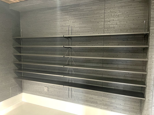 ガレージ奥には高さ調節可能な大型の収納棚があり、お荷物が多い方も安心。