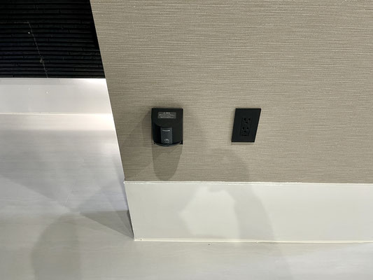 各所にあるコンセントパネルや照明スイッチもブラックで統一されていて、このガレージの雰囲気にピッタリ!