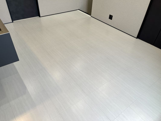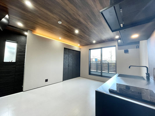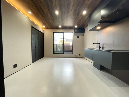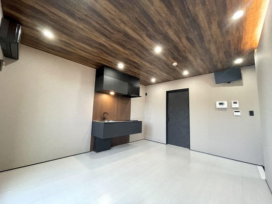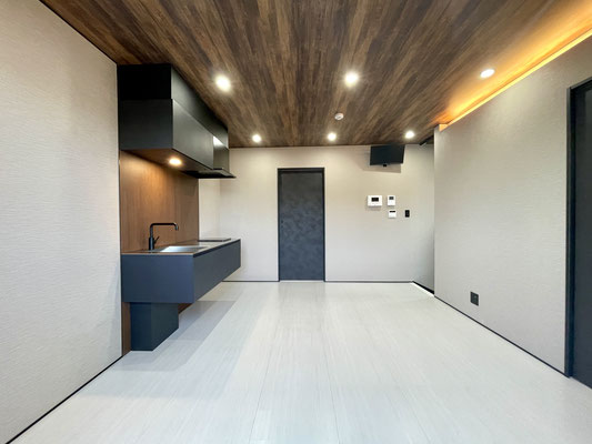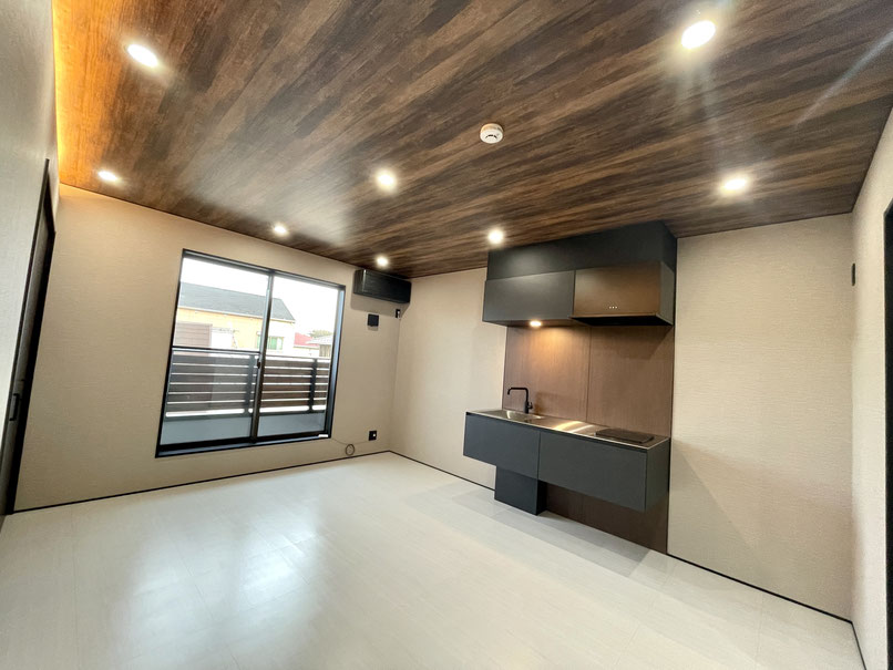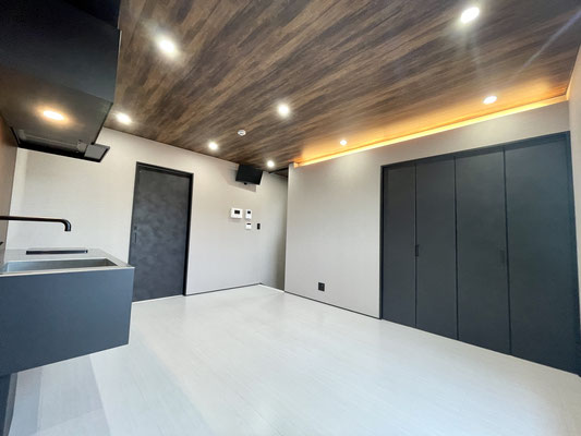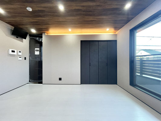 1階同様の白色のタイル床と暗めな天井のウッド調、ブラックな差し色がスタイリッシュなお部屋♪
