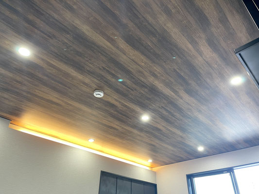 間接照明がオシャレなお部屋は天井にも無数の埋込み型ダウンライトが設置済。