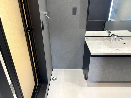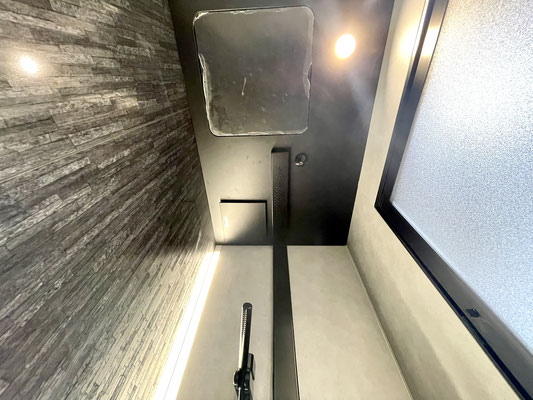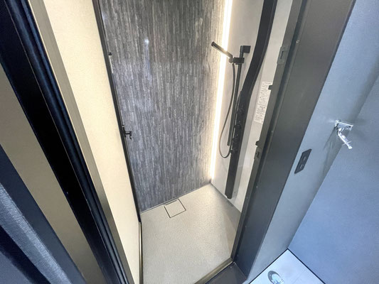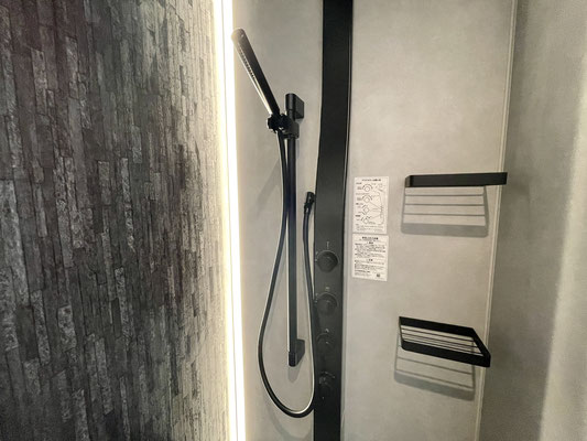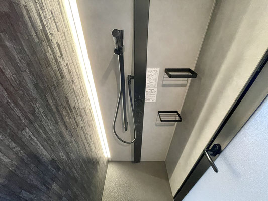 バスタブをあえて無くした省スペースにはブラックなシャワーユニットが取り付けてあります。
